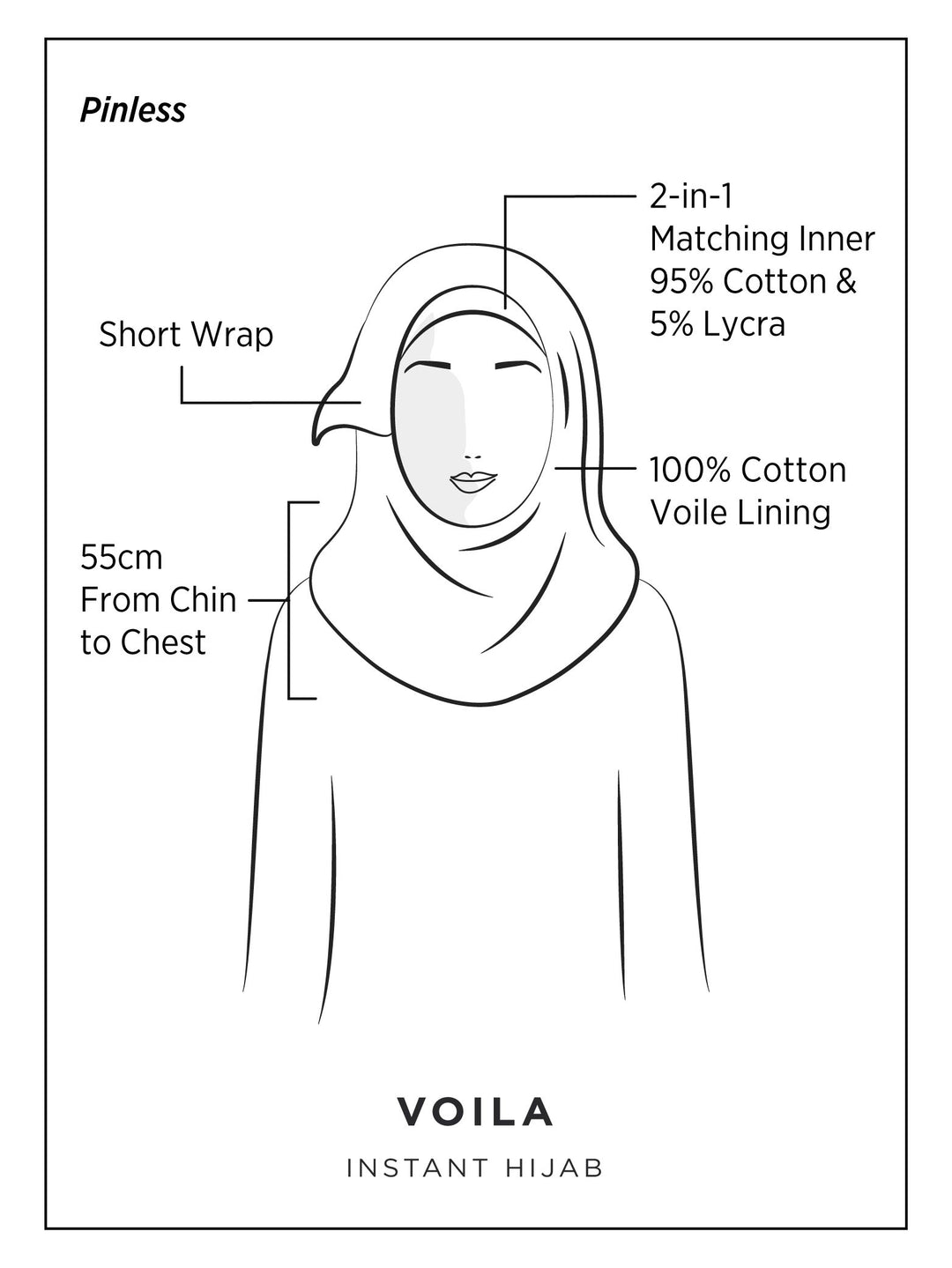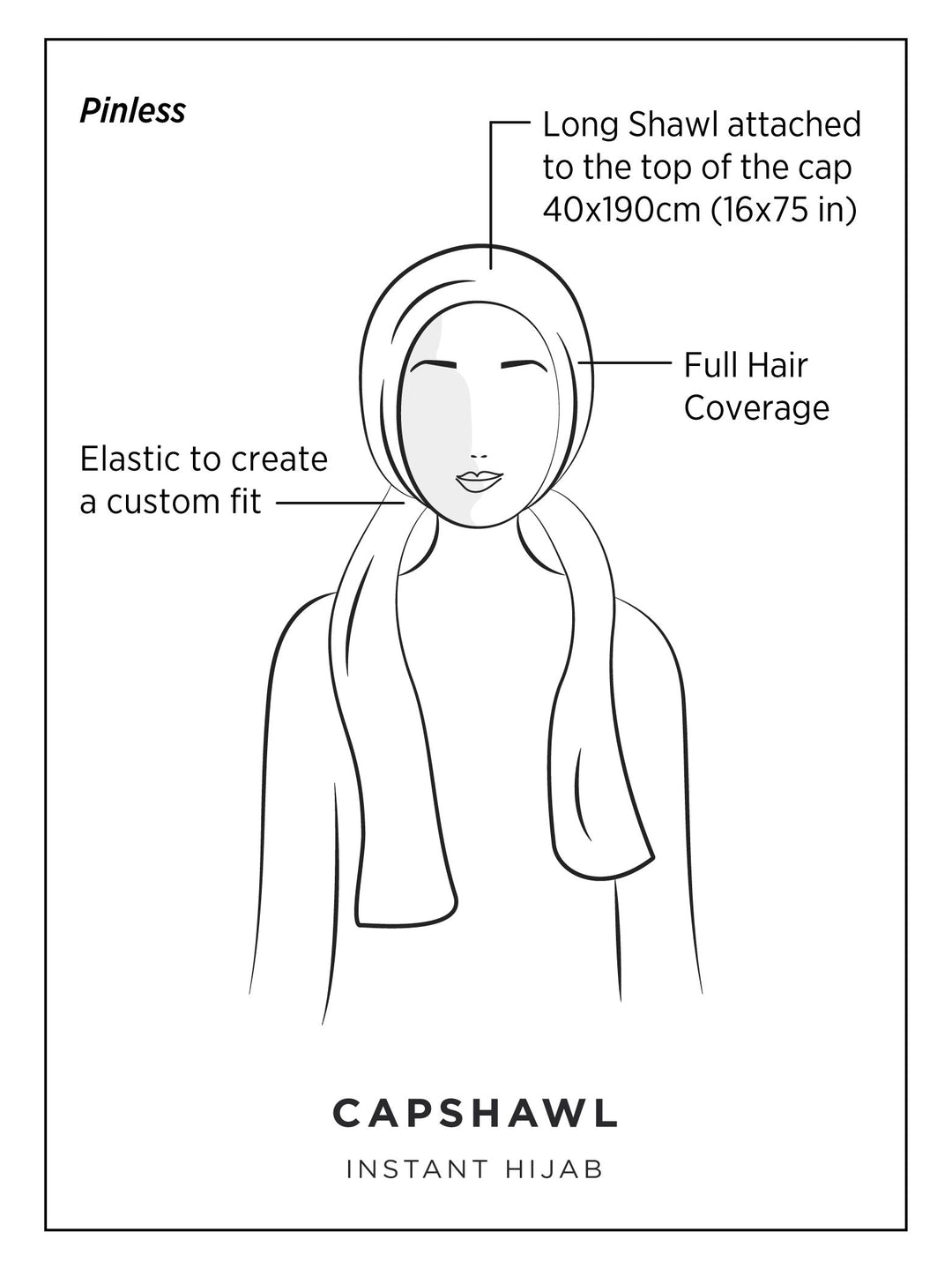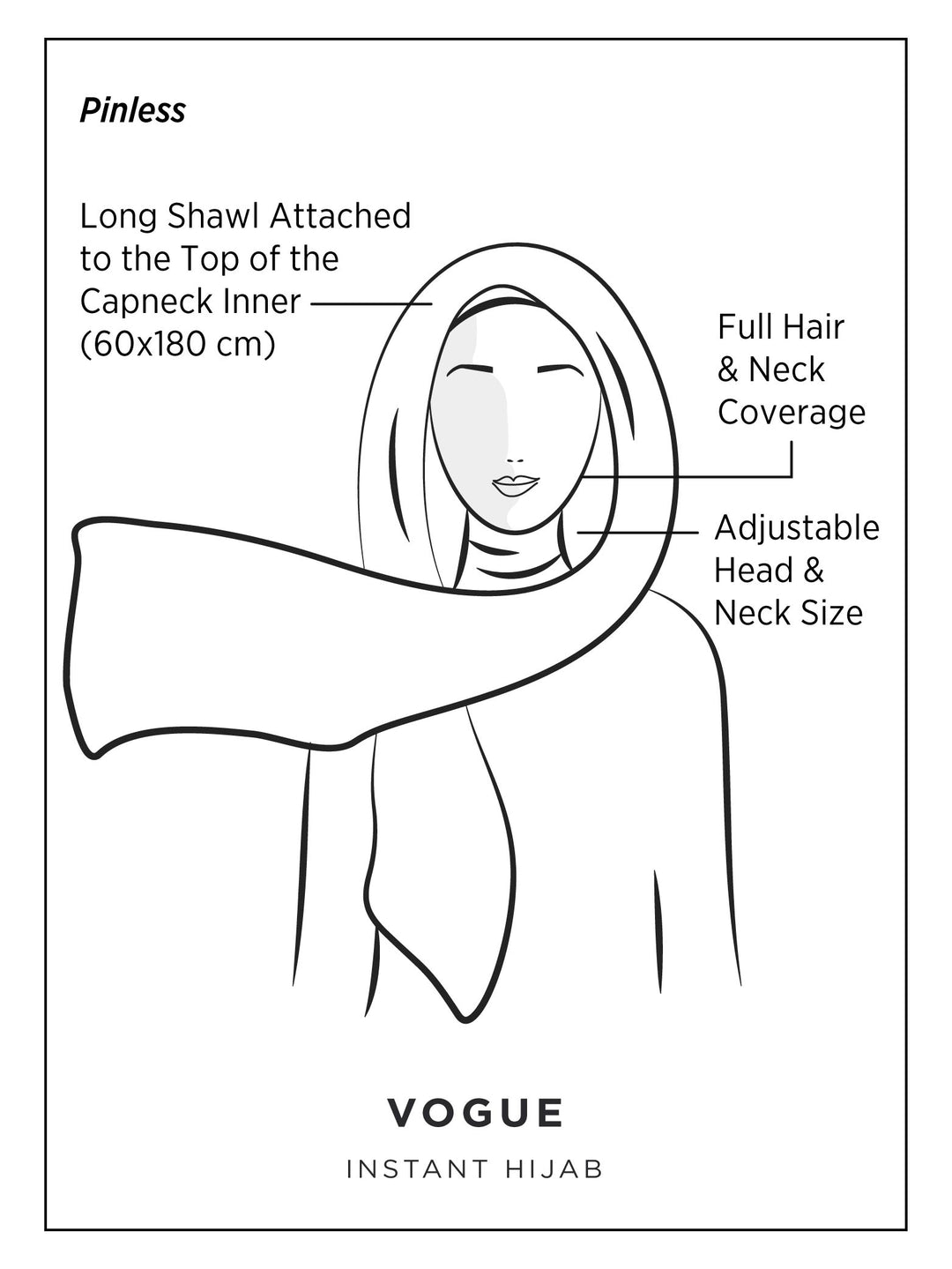 This instant hijab style will let you achieve a loose hijab or a modest turban look in no time. It features two long shawl ends 60x180cm (24x71in) attached to a full coverage inner that covers the hair and neck.