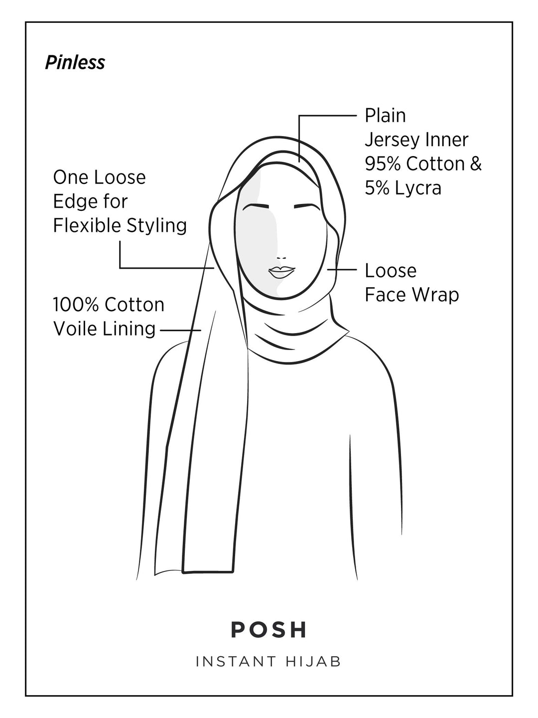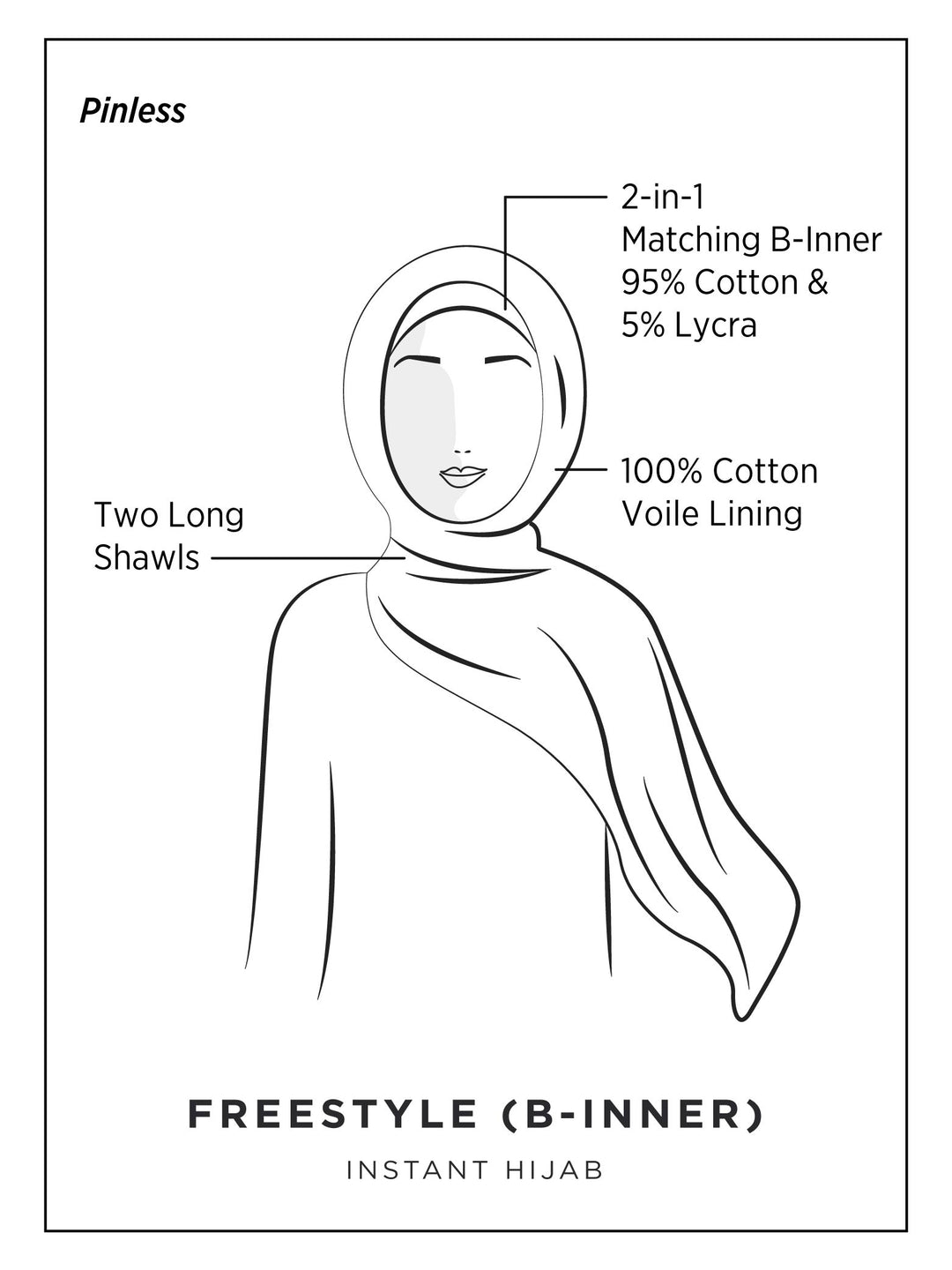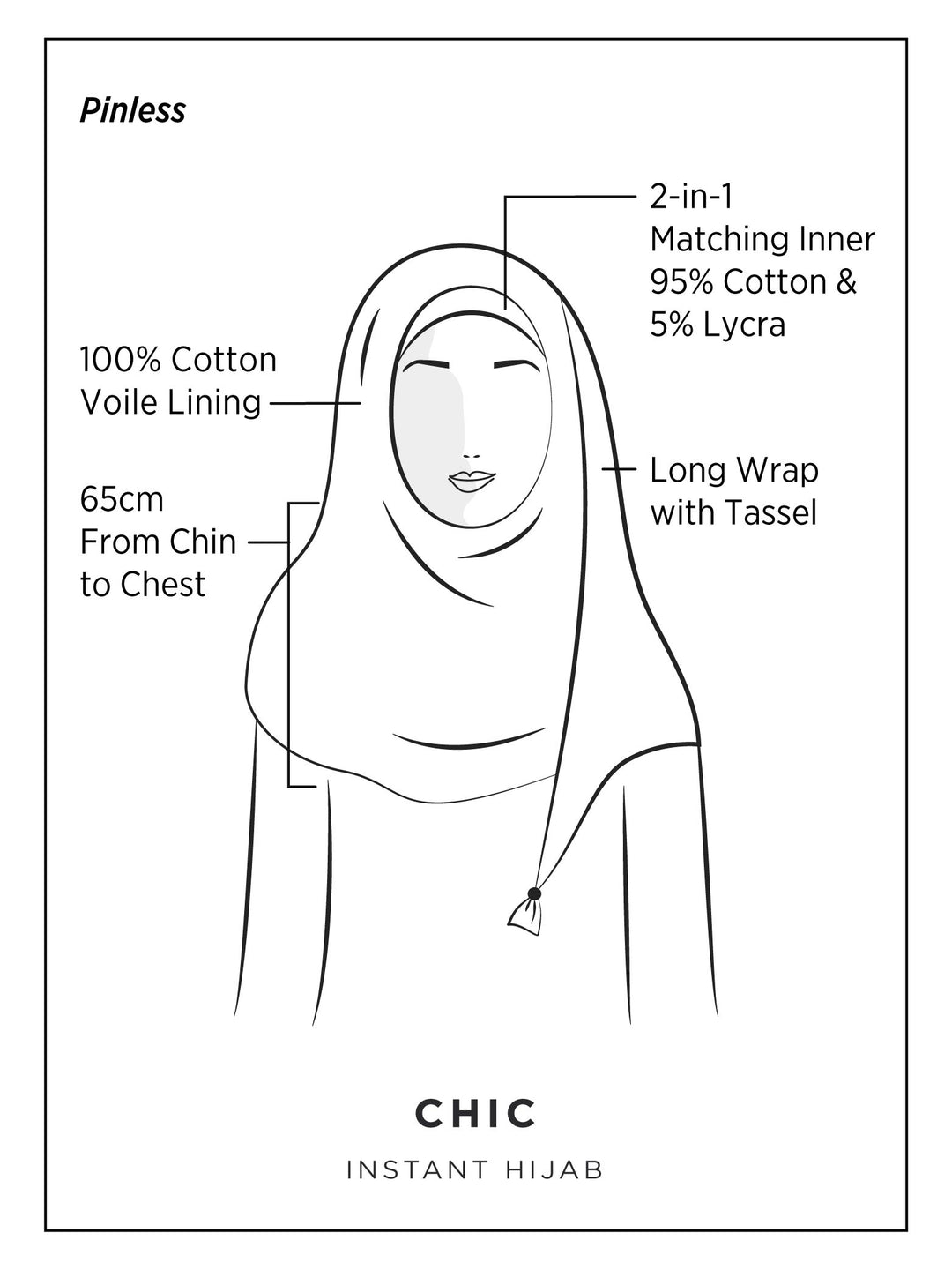 This instant hijab style will let you achieve a loose hijab or a modest turban look in no time. It features two long shawl ends 60x180cm (24x71in) attached to a full coverage inner that covers the hair and neck.