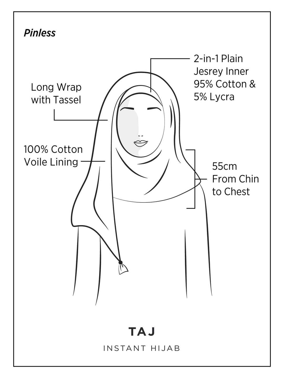 This hijab comes in 2 lengths: TAJ and TAJMAXI, and can be styled in at least 5 different ways.