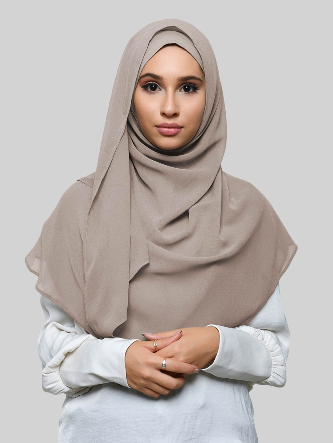 Get little chest coverage with this hijab style. It is 55cm (22in) from chin to chest and has a short wrap on the right to achieve an effortless wrapped style.