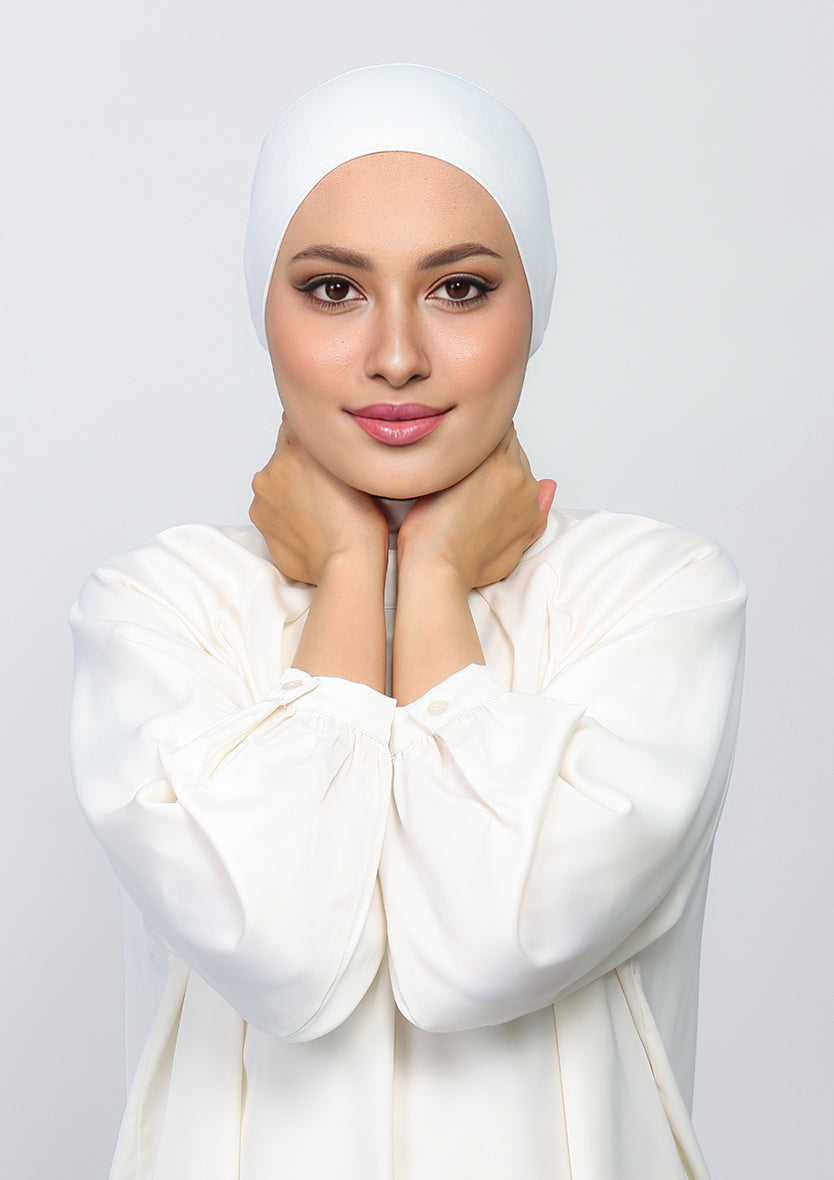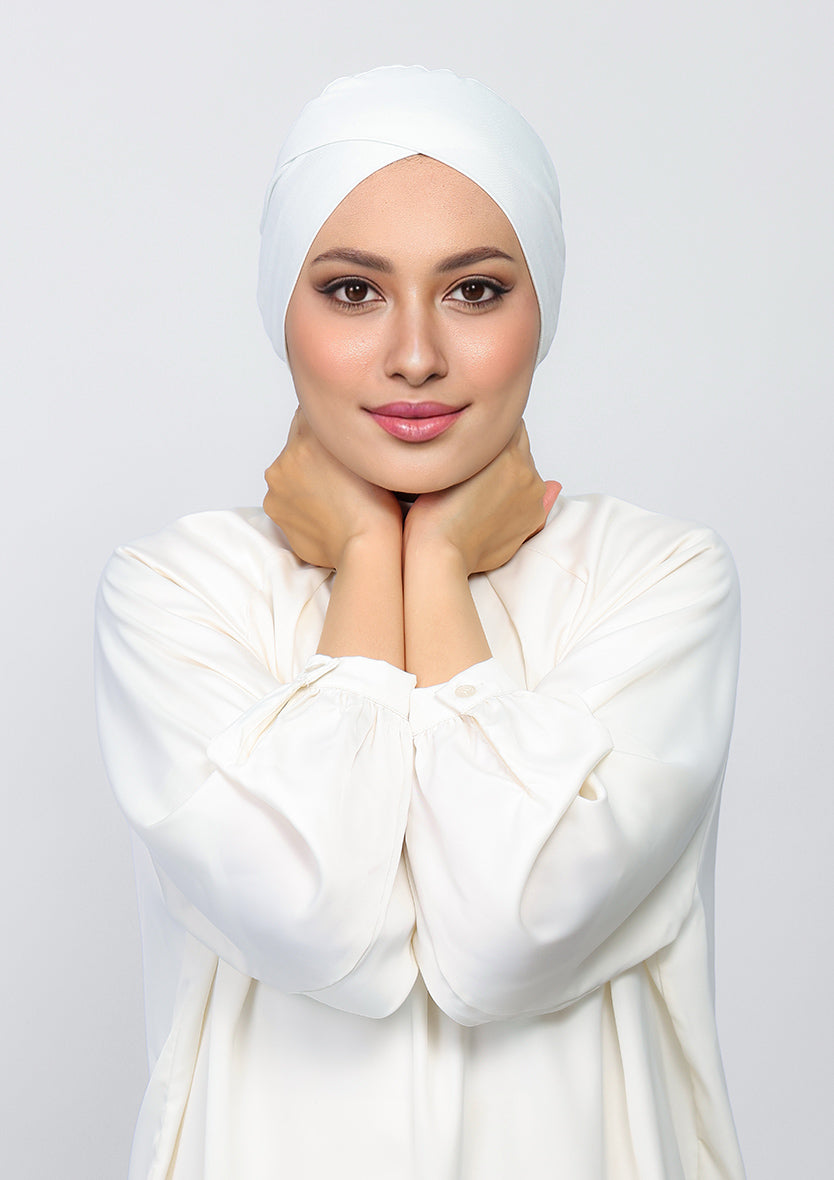 This instant hijab style is a pinless “wrapped” hijab that will let you achieve the loose hijab look without the extra layers. It features a loose wrap all around the forehead , and a hidden elastic under the chin to fit all head sizes.
