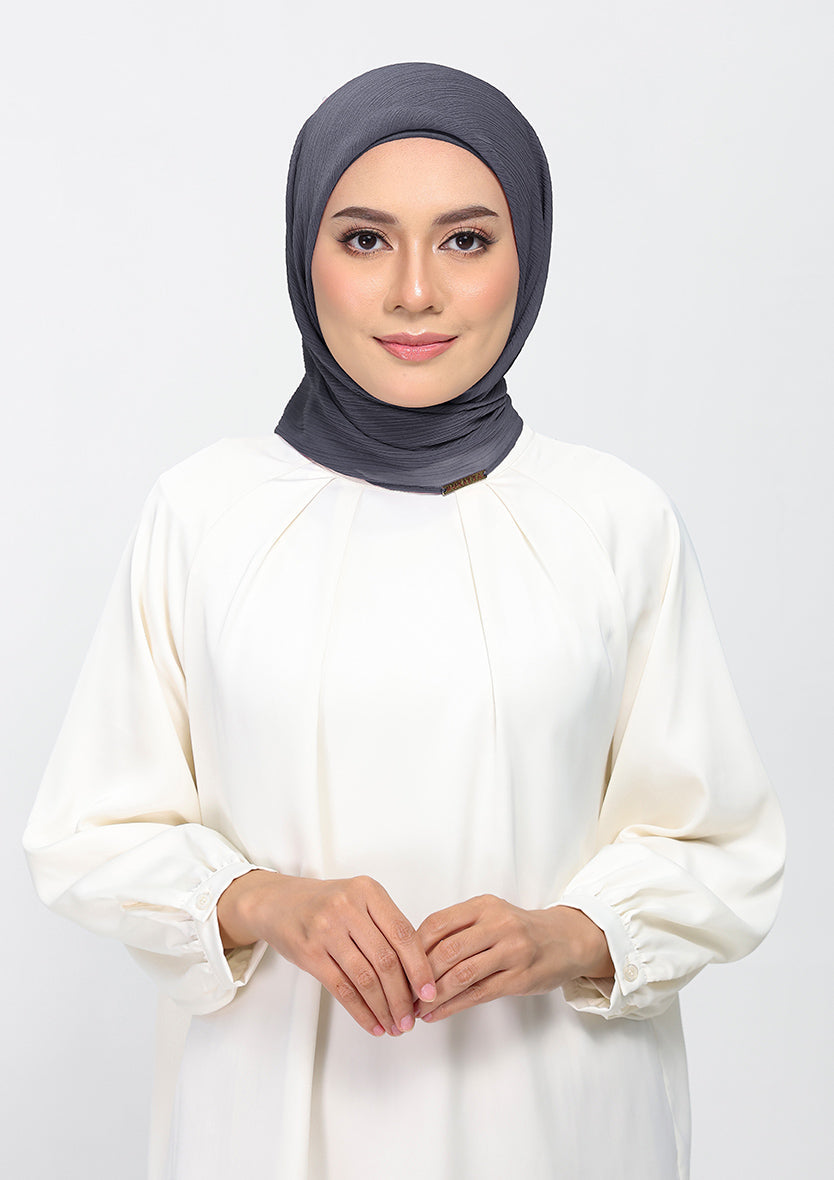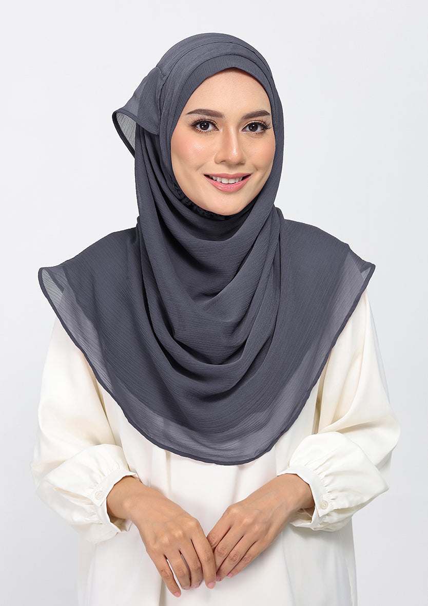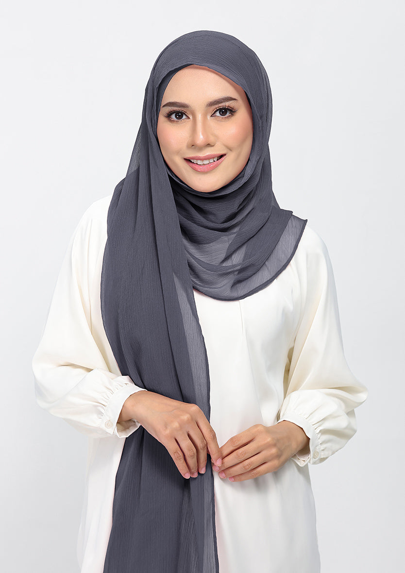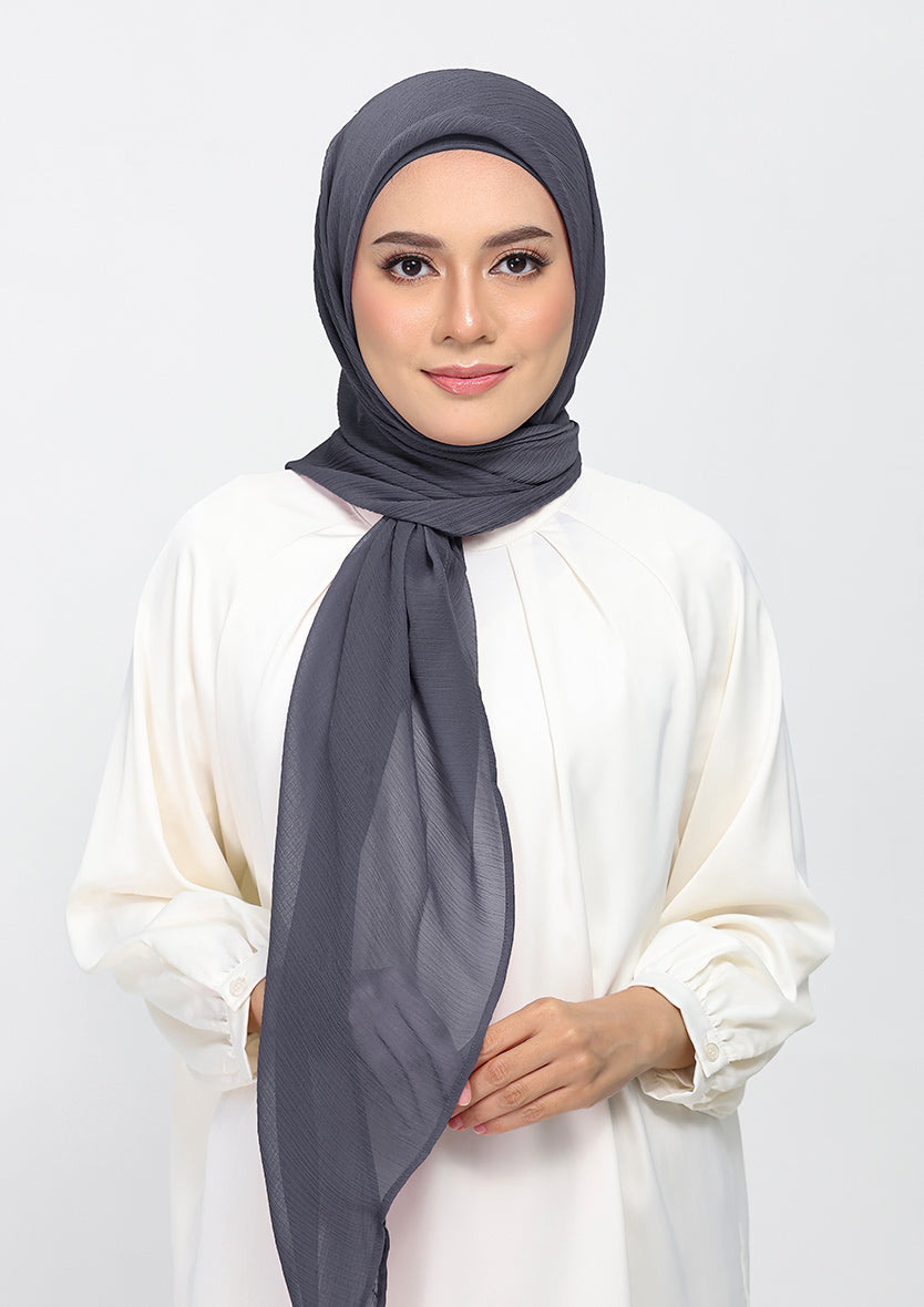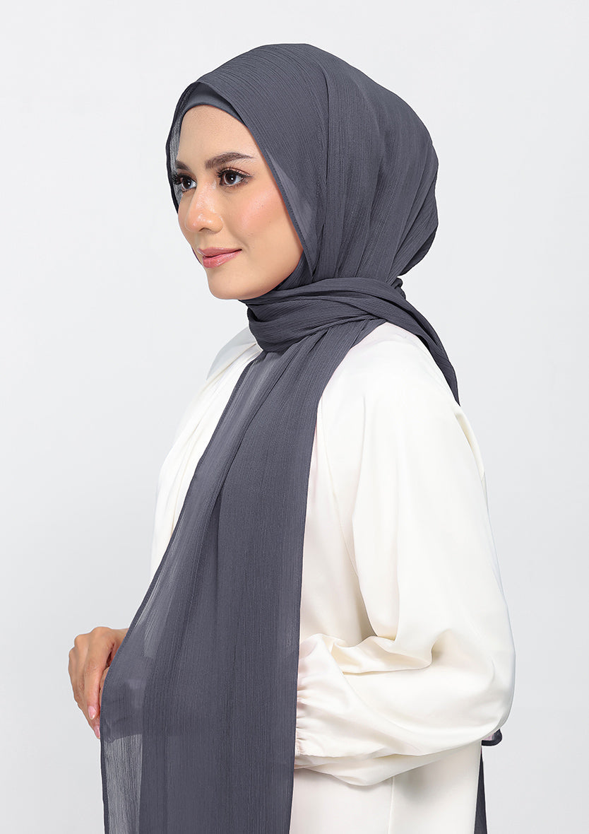 A moody stormcloud gray, perfect for adding a subtle depth to your appearance. Gray isn't bleak--its poise. Made from crinkled chiffon, this hijab is lined with 100 percent voile cotton. Each hijab comes with a matching inner.